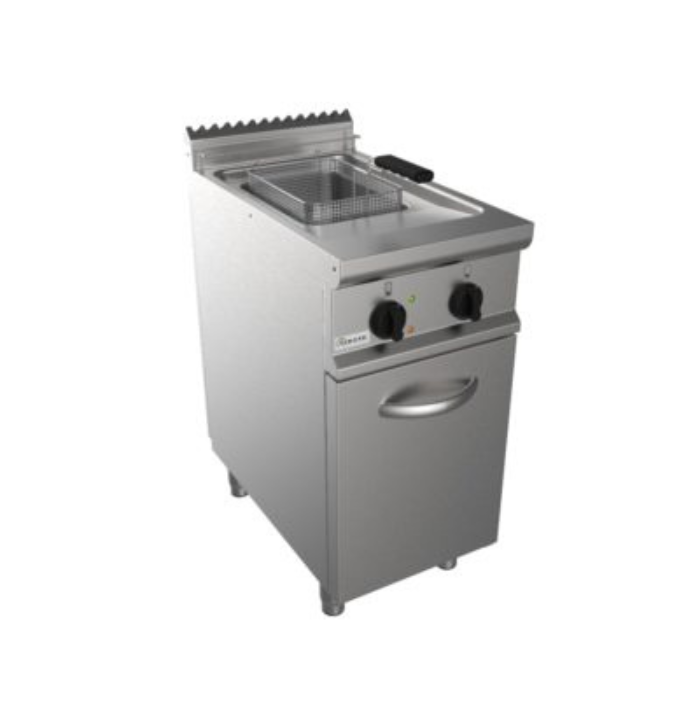 > Encimera imprimida y provista de un gran interior redondeado que permite una amplia área de expansión del aceite con el fin de evitar cualquier desbordamiento durante la cocción y el manejo de las cestas.