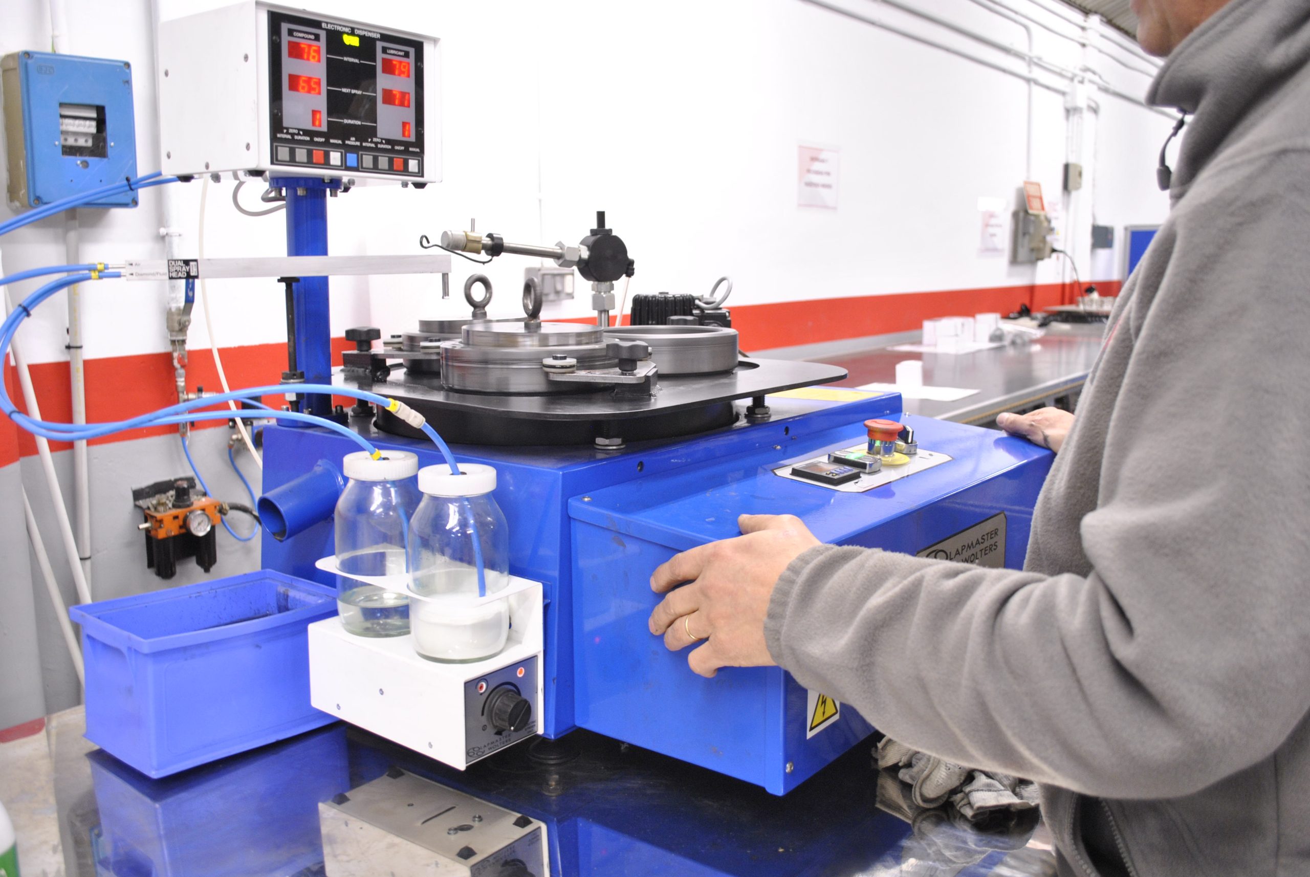 • Rectificado y lapeado de las caras de roce con lapeadoras de diamante hasta alcanzar la planitud requerida entre 1 y 3 bandas luz.
